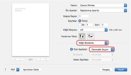 Yazdırma seçenekleri açılır menüsünden [Paper Feed] öğesini ve ardından [All Pages From] açılır menüsünden önceden basılı kağıdın yüklendiği kağıt kaynağını seçin.