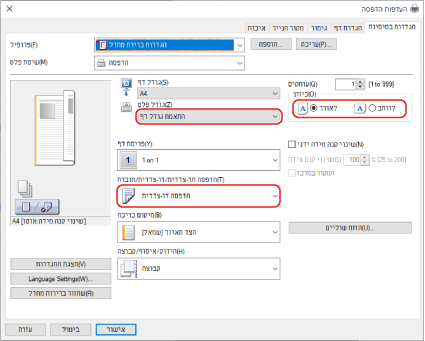 בחר את גודל הנייר הטעון והמודפס מראש ב [גודל הדף], ובחר באפשרות הדפסה לאורך או לרוחב [Orientation] בהתאמה לכיוון של מסמך המקור.