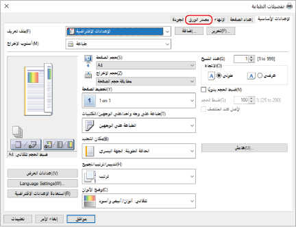 حدد الجهاز في نافذة الطباعة، ثم انقر فوق [تفضيلات]، أو [خصائص الطابعة]، أو [خصائص].
