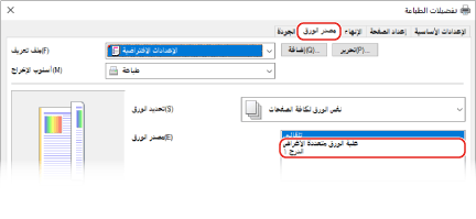 في علامة التبويب [مصدر الورق]، حدد مصدر الورق الذي يتم فيه تحميل الورق المطبوع مسبقًا في [مصدر الورق].