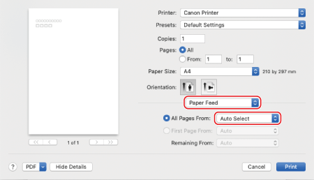 Izberite [Paper Feed] v priročnem meniju z možnostmi tiskanja in nato v priročnem meniju [All Pages From] izberite vir papirja, v katerega je vložen predhodno potiskani papir.