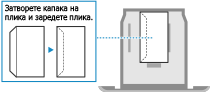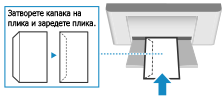 Заредете пликовете така, че ръбът с капака да е към лявата страна, като предната страна (страната, на която се печата) да гледа нагоре.