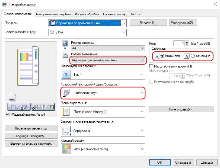 На вкладці [Основні параметри] зазначте формат паперу, орієнтацію та сторони друку.