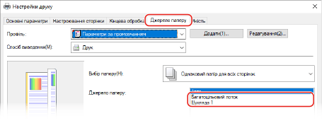 На вкладці [Джерело паперу] у пункті [Джерело паперу] виберіть джерело паперу, куди буде завантажено бланк.