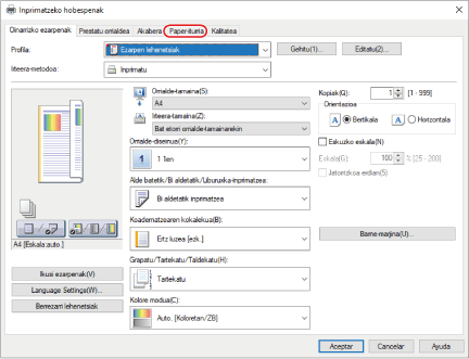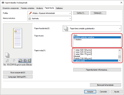 Aukeratu hemen [Paper-iturria] gutun-azalak kargatuta dauden paper-iturria eta hautatu [Gutun-azala] hemen [Paper mota].