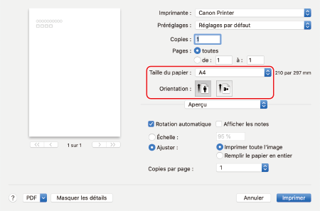 Sélectionnez le format du papier pré-imprimé chargé dans [Taille du papier], et sélectionnez portrait ou paysage dans [Orientation] selon l’orientation du document original.