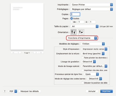 Dans le menu contextuel des options d'impression, sélectionnez [Fonctions d’imprimante].
