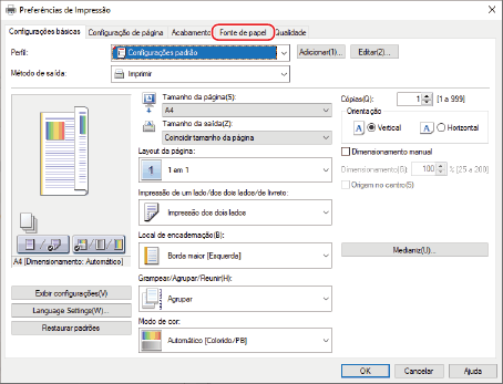 Clique em [Fonte de papel] na janela de configurações de impressão do driver da impressora.