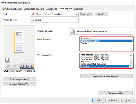 Selecione a fonte de papel onde os envelopes estão carregados em [Fonte de papel] e selecione [Envelope] em [Tipo de papel].