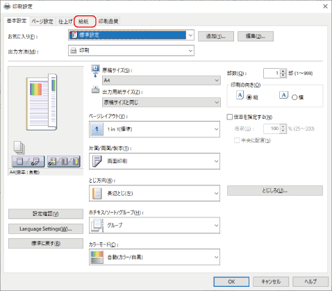 プリンタードライバーの印刷設定画面で、[給紙]をクリックする