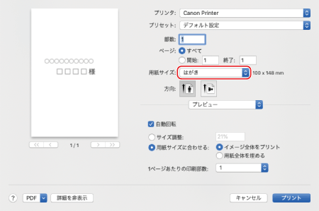 [用紙サイズ]でセットしたはがきのサイズを選ぶ