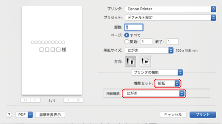 [給紙部]ではがきをセットした給紙部を選び、[用紙種類]で[はがき]を選ぶ