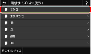 手差しトレイにはがきをセットすると、用紙サイズを設定する画面が表示されます。以下の手順に従って設定してください。