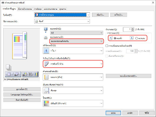 เลือก [การพิมพ์ 1 ด้าน] หรือ [การพิมพ์ 2 ด้าน] ใน [1 ด้าน/2 ด้าน/การพิมพ์หนังสือ]