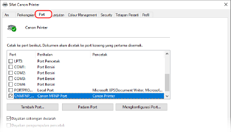 Jika anda menukar tetapan protokol cetakan (LPD atau RAW) atau nombor port pada mesin, tukar juga tetapan pada komputer kepada tetapan yang sama. Operasi ini tidak diperlukan untuk port WSD.