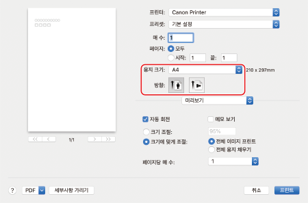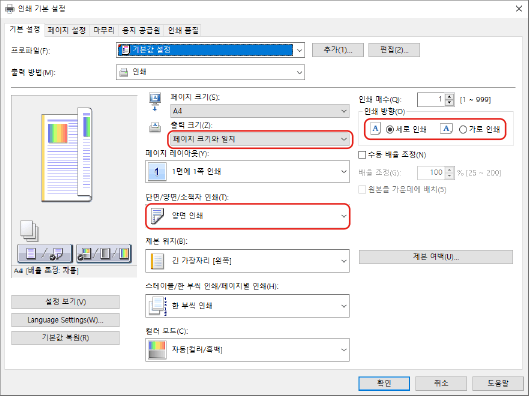 [기본 설정] 탭에서 용지 크기, 인쇄 방향 및 인쇄면을 지정합니다.