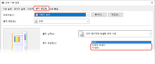 용지를 자주 바꾸어야 하는 경우, <임의>로 설정하면 매번 해야 하는 변경 설정 단계를 줄일 수 있습니다. 단, 본 설정은 프린터 드라이버의 용지 종류 설정과 실제로 컴퓨터에 적재된 용지 종류가 일치하지 않는 경우에도 컴퓨터가 인쇄를 실행한다는 점에 주의하십시오.