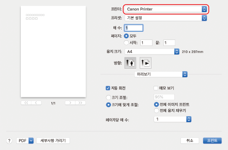 인쇄 창에서 기기를 선택하고 [기본 설정], [프린터 속성] 또는 [속성]을 클릭합니다.