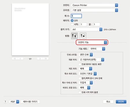 인쇄 옵션 팝업 메뉴에서 [프린터 기능]를 선택합니다.