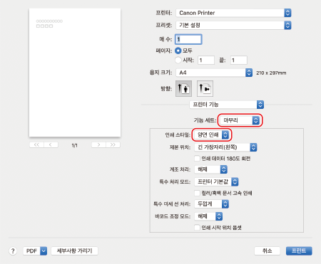 [기능 세트]에서 [마무리]를 선택한 다음, [인쇄 스타일]에서 [단면 인쇄] 또는 [양면 인쇄]를 선택합니다.