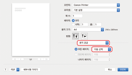 프린터 드라이버의 용지 설정이 [자동]으로 되어 있으면, 컴퓨터는 용지 종류가 [보통 용지1]인 경우와 동일한 방식으로 작동합니다.