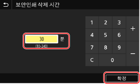 보안 문서가 메모리에 보관되는 기간을 변경한 후 <확정>을 누릅니다(