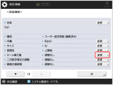 (設定/登録)→[環境設定]→[用紙設定]→[用紙種類の管理設定]→リストから編集する用紙種類を選択→[詳細/編集]→ <用紙のスキ目設定>の[変更]を押す
