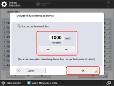 Set a value between 50 and 9999 sheets as the interruption interval for adjustment pages, and then press [OK].