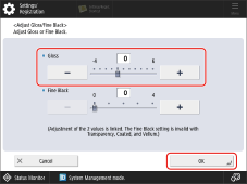 → [Preferences] → [Paper Settings] → [Paper Type Management Settings] → select the type of paper you are using that is having this problem → press [Details/Edit] → [Change] for <Adjust Gloss/Fine Black> → adjust the value for [Gloss] toward the minus end.