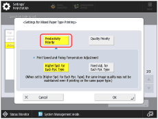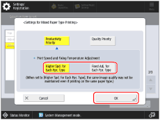 The temperature of the fixing unit in the machine is adjusted every time printed paper is changed depending on the paper types or the paper weights of the used paper. When printing a job with changing multiple types of paper, waiting time is required every time printed paper is changed because adjusting the temperature is required. Productivity can be improved by selecting <Higher Spd. for Each Ppr. Type> or <Fixed Adj. for Each Ppr. Type> under <Productivity Priority>.