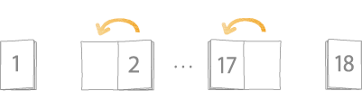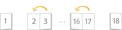 Confirm the settings for <Back cover> as well as the settings for <Front cover>. For example, if you set [Print on outside] for both <Back cover> and <Front cover>, and print a job that has a total of 18 pages, the pages are printed as shown below.