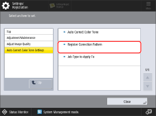 → [Adjustment/Maintenance] → [Adjust Image Quality] → [Auto Correct Color Tone Settings] → [Register Correction Pattern] to select the paper.