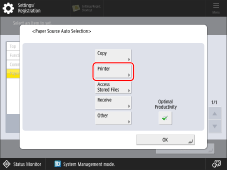 If you clear the check box for <Optimal Productivity>, the machine switches a paper source to another after the paper source in use for paper feeding completely runs out of paper. Printing is interrupted for a slight moment during this paper source switching. If you select the check box for <Optimal Productivity>, the machine switches a paper source to another with 50 to 100 sheets of paper remaining in the paper source in use. This can prevent interrupting a print job and help you to improve productivity.