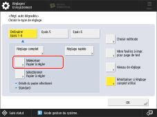 → [Préférences] → [Réglages papier] → [Réglages papier] pour définir le type de papier.