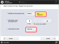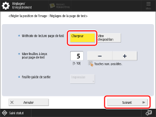 Sélectionner [Chargeur] dans <Régler la position de l'image : Réglages de la page de test>, régler le nombre de copies de la page de test, et appuyer sur [Suivant].