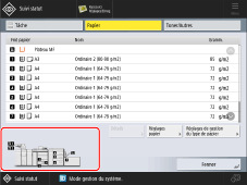 L'alimentation papier en cours d'utilisation est sur fond jaune dans l'image du coin inférieur gauche de l'écran.