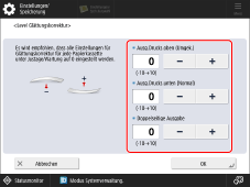 Berühren Sie die Taste [-] oder [+] unter [Ausg.Drucks.oben (Umgek.)], [Ausg.Drucks.unten (Normal)] oder [Doppelseitige Ausgabe], um die Stufe der Glättungskorrektur einzustellen, und berühren Sie anschließend die Taste [OK].