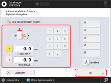 → [Präferenzen] → [Einstellungen Papier] → [Einstellungen Verwaltung Papiertyp] → Wählen Sie den Papiertyp, den Sie bearbeiten wollen, aus der Liste aus → Berühren Sie die Taste [Details/Bearbeiten] → [Ändern] für <Bildposition justieren>.