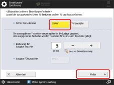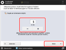 Wählen Sie [Zufuhr] unter <Bildposition justieren: Einstellungen Testseite> aus, geben Sie die Anzahl der zu erstellenden Testseiten ein und berühren Sie die Taste [Weiter].