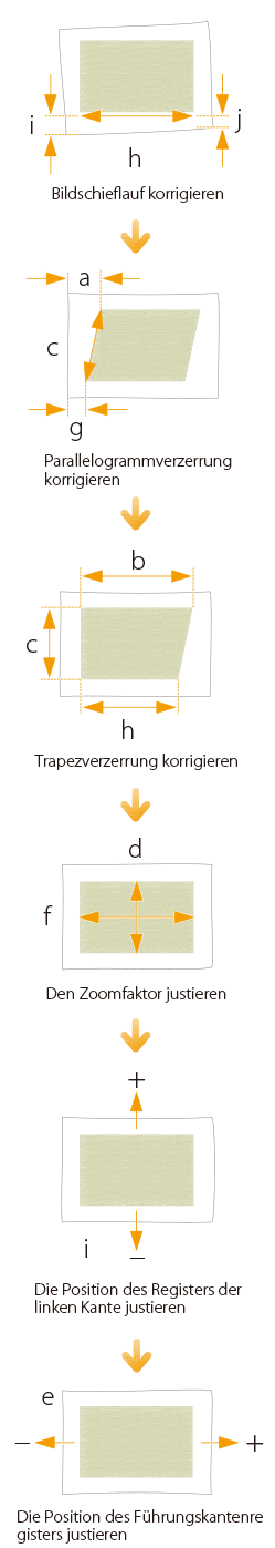 Wenn die Bilder auf der Vorder- und Rückseite falsch zueinander ausgerichtet sind und Sie eine einfache Ausrichtung vornehmen möchten, können Sie die Ausrichtung der Bilder durch Scannen der Testseiten mit dem Führungsblatt justieren.