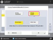 → [Präferenzen] → [Einstellungen Papier] → [Einstellungen Verwaltung Papiertyp] → wählen Sie den verwendeten Papiertyp aus, der dieses Problem aufweist → berühren Sie die Taste [Details/Bearbeiten] → [Ändern] für <Glanz/Feinschwarz justieren> → passen Sie den Wert für [Glanz] in Richtung des Minus-Endes an.