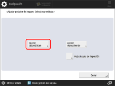 → [Preferencias] → [Opciones de papel] → [Opciones de gestión de tipos de papel] → Seleccione el tipo de papel que desea editar de la lista → pulse [Detalles/Editar] → [Cambiar] para <Ajustar posición de imagen>.