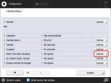 Seleccione en la lista el tipo de papel que desee editar → pulse [Detalles/Editar] → [Cambiar] para <Nivel corrección curvatura>.