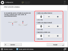 Pulse [-] o [+] en [Salida cara arriba (inverso)], [Salida cara abajo (normal)], o [Impresión a doble cara] para ajustar el nivel de corrección de curvatura y, a continuación, pulse [Aceptar].