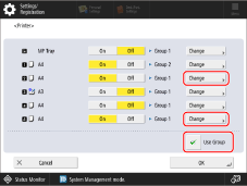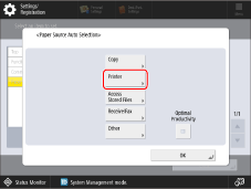 If you clear the check box for <Optimal Productivity>, the machine switches a paper source to another after the paper source in use for paper feeding completely runs out of paper. Printing is interrupted for a slight moment during this paper source switching. If you select the check box for <Optimal Productivity>, the machine switches a paper source to another with 50 to 100 sheets of paper remaining in the paper source in use. This can prevent interrupting a print job and help you to improve productivity.