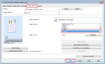 Select the [Paper source] tab and specify the settings as described below → click [OK].