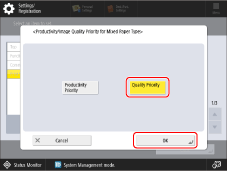 → <Function Settings> → <Common> → <Print Settings> → <Productivity/Image Qlty. Priority for Mixed Paper Type> → <Quality Priority>.