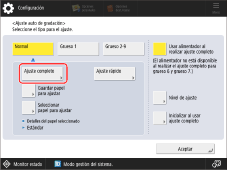Pulse <Seleccionar papel para ajustar> y seleccione el papel para la calibración cargado o <Estándar> (para el papel recomendado).