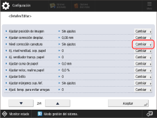 Seleccione en la lista el tipo de papel que desee editar → pulse <Detalles/Editar> → <Cambiar> para <Nivel corrección curvatura>.