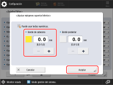 → <Preferencias> → <Opciones de papel> → <Opciones de gestión de tipos de papel> → seleccione el tipo de papel que está utilizando y que tiene este problema → pulse <Detalles/Editar> → <Cambiar> para <Ajustar márgenes sup./inf.> → ajuste el valor de <Borde de cabecera> hacia el extremo positivo.